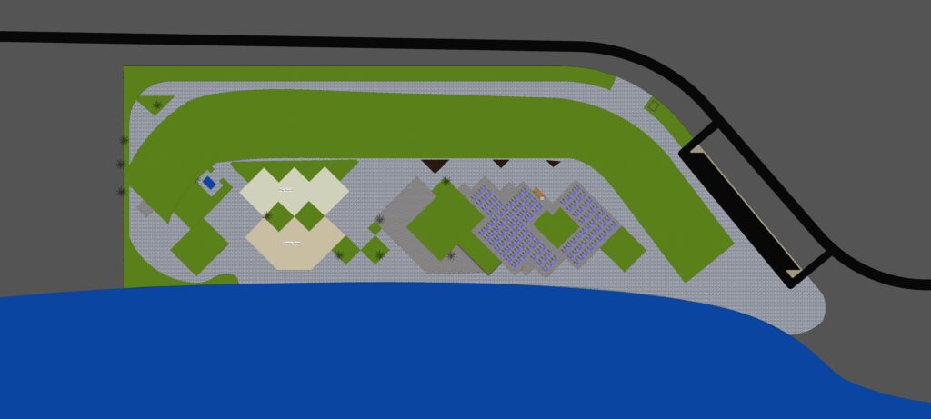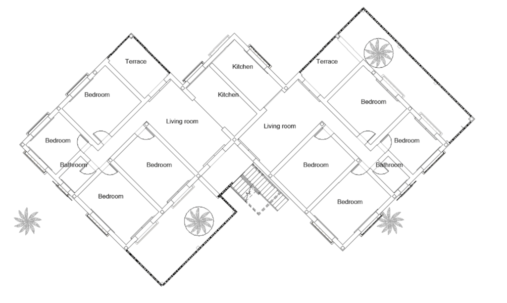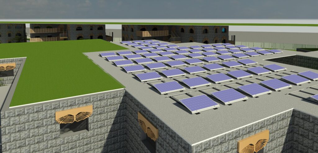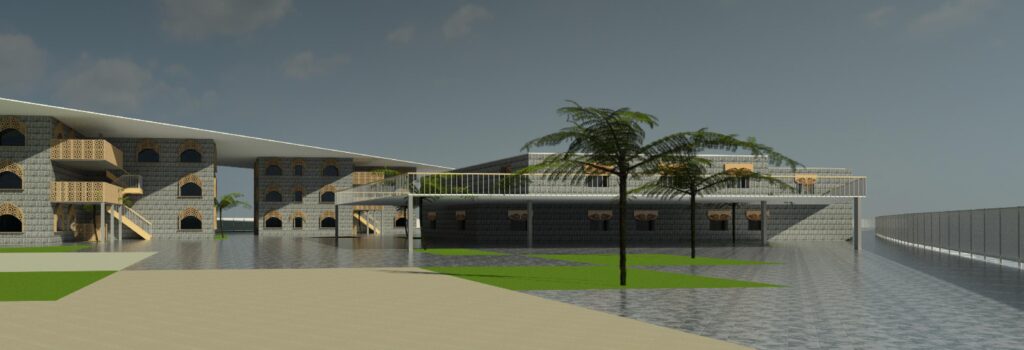 Water from the adjacent river is utilised for daily needs through an efficient collection and treatment system, while building orientation, shading, and material selection minimise heat gain and energy use.